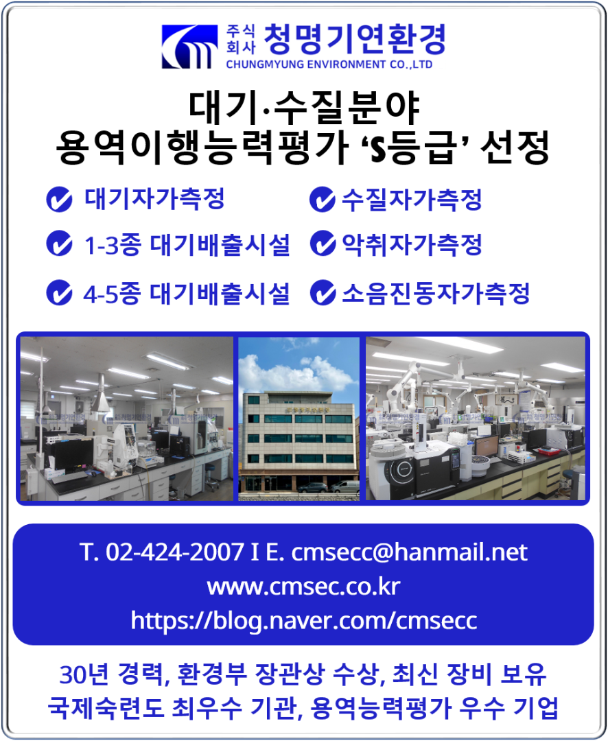 대기·수질분야 용역이행능력평가 'S등급' 선정 - ㈜청명기연환경 (대기자가측정, 수질자가측정, 자가측정대행)